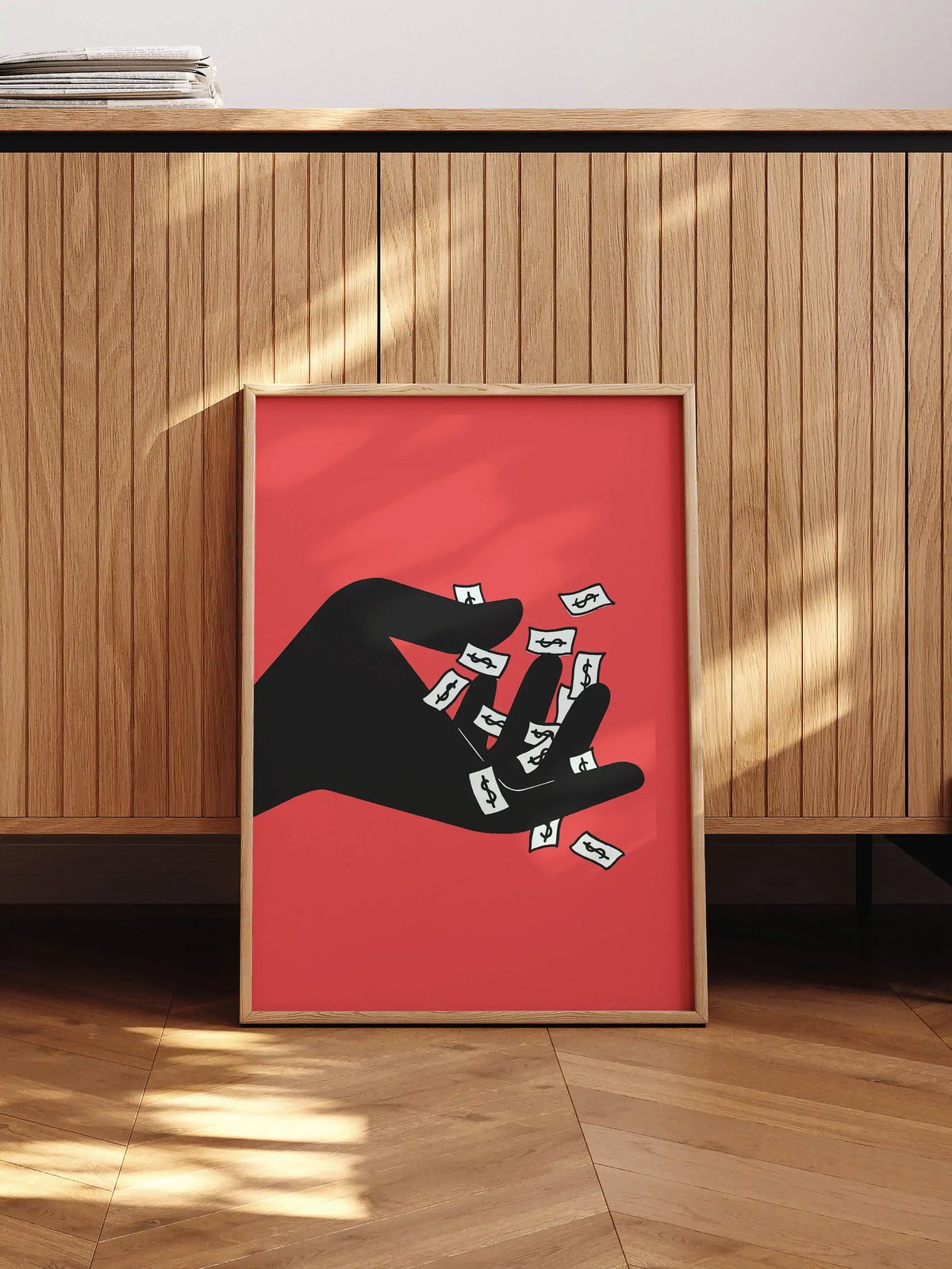 Symbolique et frappant, cette œuvre d'art représente une main en silhouette perdant prise sur des billets éparpillés. Un commentaire moderne sur la finance, l'ambition et le flux incessant de l'argent.